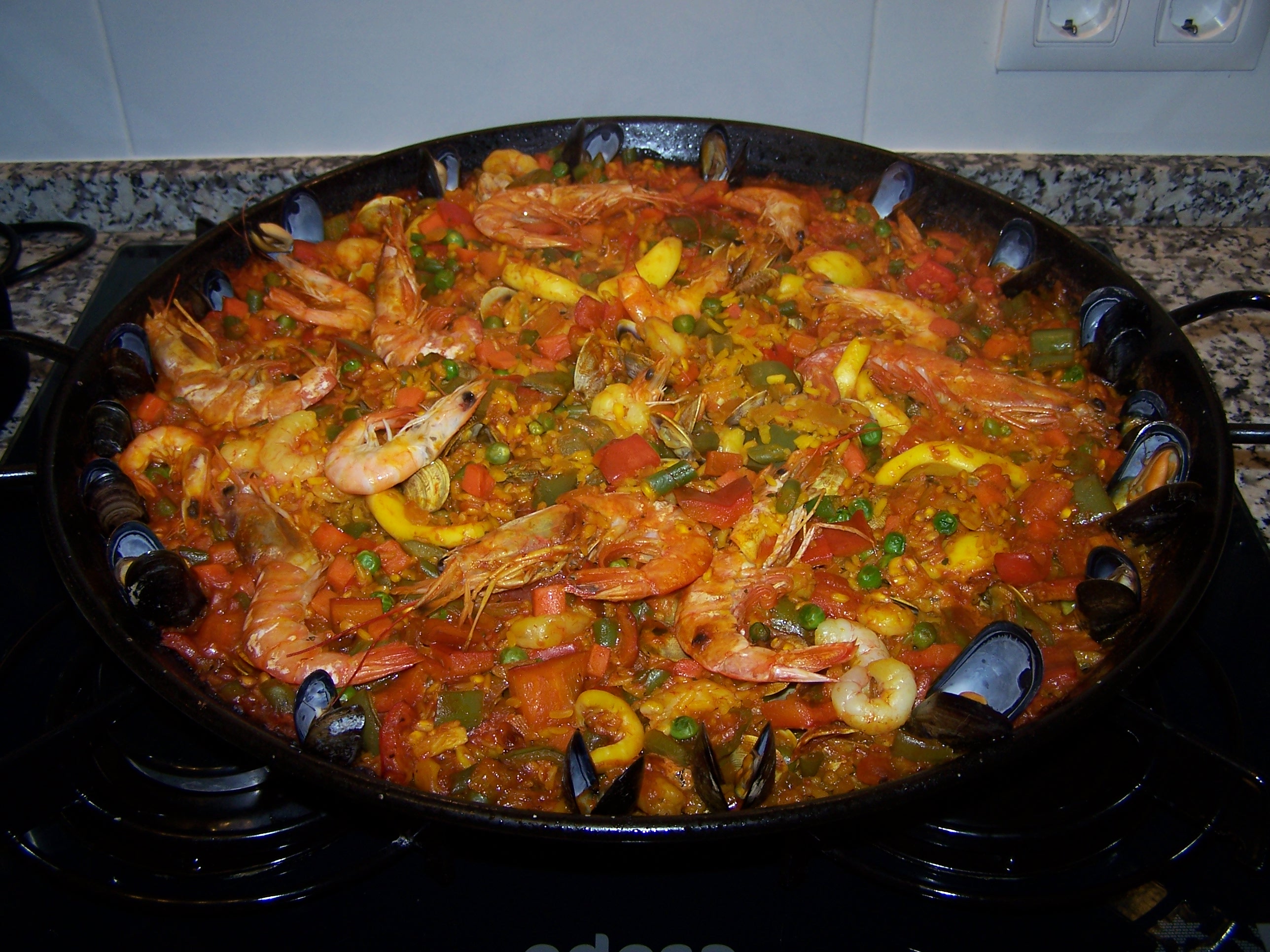 Die vorgebratenen Hähnchenteile (je nach Geschmack) hinzugeben und weitere 5 Minuten dünsten3 große Tassen Reis zugeben und 3-5 Minuten anbraten. Dann 3 Zehen Knoblauch, Safran und Colorante hinzugeben.6 große Tassen Wasser, oder besser Boullion nach und nach hinzugeben. Nicht zu große Hitze, damit es nicht anbrennt. Von jetzt an sollte eigentlich nicht mehr viel umgerührt werden.Nach 10-15 Minuten Gambas, Tintenfisch und Herzmuschel (Berberechos) oder alternativ Venusmuscheln (Almejas) hinzugeben. Die Venusmuscheln sind etwas größer.Dann noch 1 Dose Erbsen/Karotten hinzu und wem`s gefällt, das Ganze mit ein paar Cigallas bestücken.Zur Dekoration den Rand noch mit vorgekochten Miesmuscheln dekorieren.Das Ganze jetzt noch solange kochen, bis der Reis gar ist. Bei Bedarf noch etwas Wasser oder Boullion nachgeben. Wenn`s geklappt hat, müsste es eigentlich so aussehen: